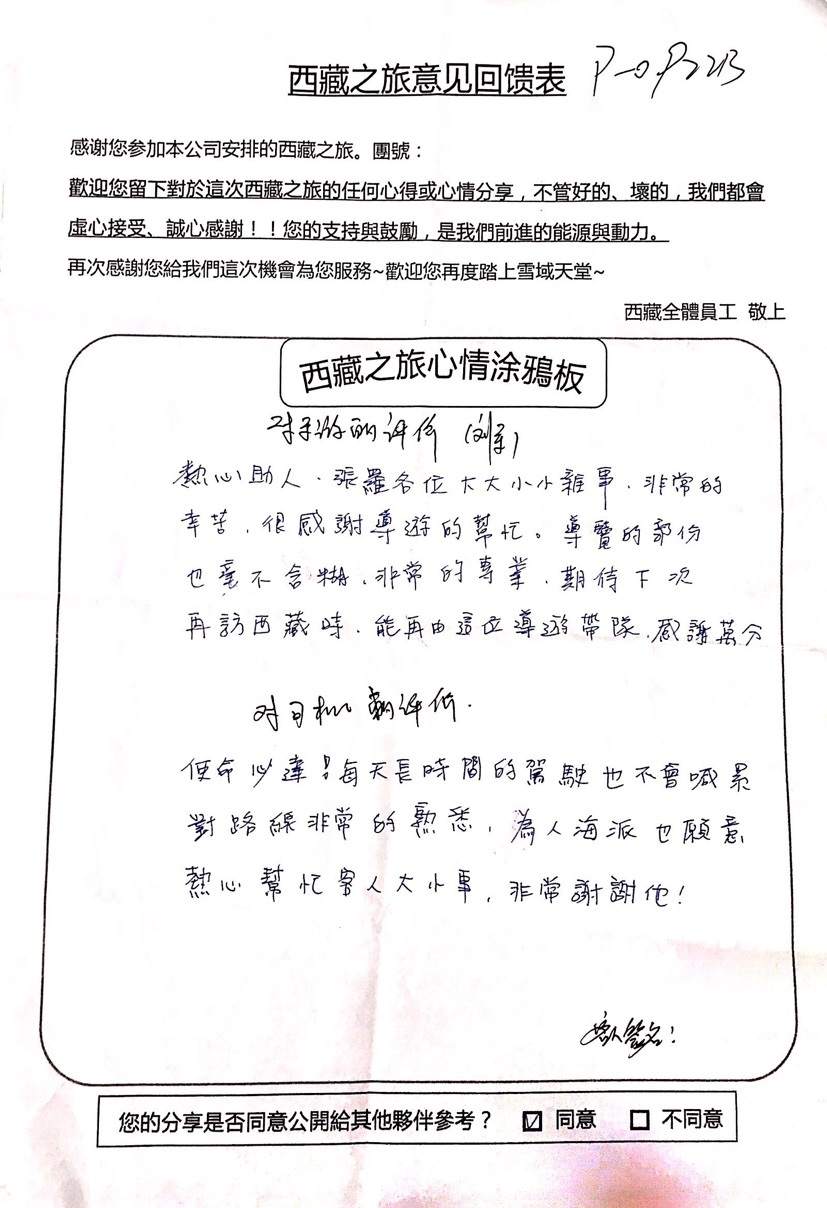 歐力給 ★★★★★旅游时间: 2018-11-15劉導熱心助人,張羅各位大大小小雜事,非常的辛苦,很感謝導遊的幫忙。導覽的部分也毫不含糊,非常的專業,期待下次再訪西藏時能再由這位導遊帶隊,感謝萬分。 司機師傅使命必達!每天長時間的駕駛也不會喊累,對路線非常的熟悉,為人海派也願意熱心幫忙客人大小事,非常謝謝他!